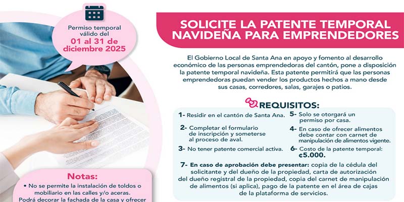 El Gobierno Local de Santa Ana, en su compromiso con el fomento al desarrollo económico local y el apoyo a las personas emprendedoras del cantón, anuncia la apertura de la “Patente Temporal